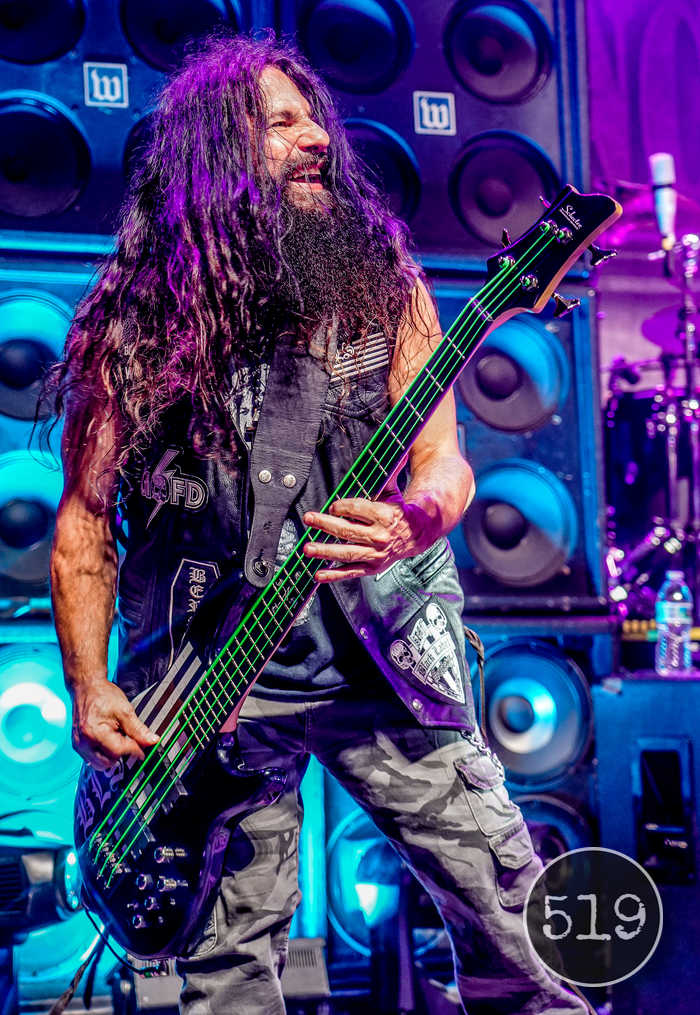 While the match was lit, and the fire was burning Anthrax was getting ready to blow the lid off this place. After 40 years of thrashing all over this world to legions of fans worldwide tonight was Detroit’s night to feel the immense power of Anthrax’s 40th Anniversary. Before their set started, we got a white drop cloth screen with everyone from Chuck D, Rob Zombie, Dee Snider and even Keanu Reeves congratulating Anthrax on their 40 years and how much they love them. Bringing with them a catalog of original material that could burn your ears off, they went balls to the walls with the fire starter “Among the Living”. Then fan favs “Caught in a Mosh”, “Madhouse”, “Metal Trashing Mad” as the band when all out wild as Bassist Frank Bello was on the top risers above Charlie just losing his mind.