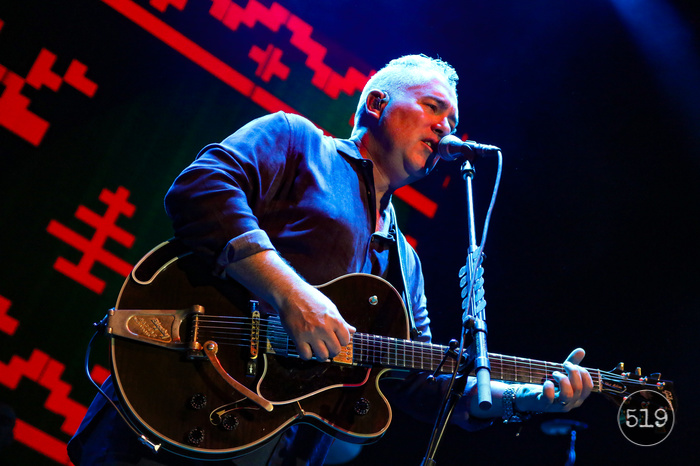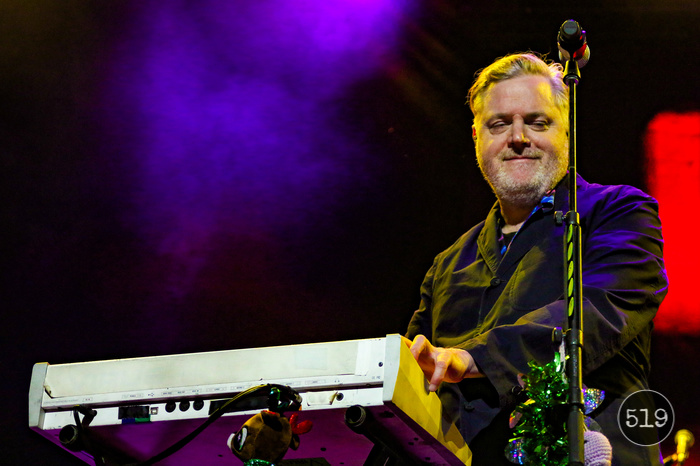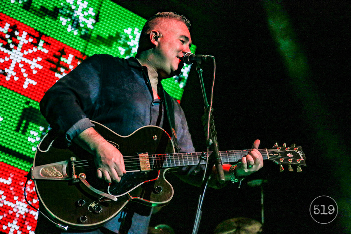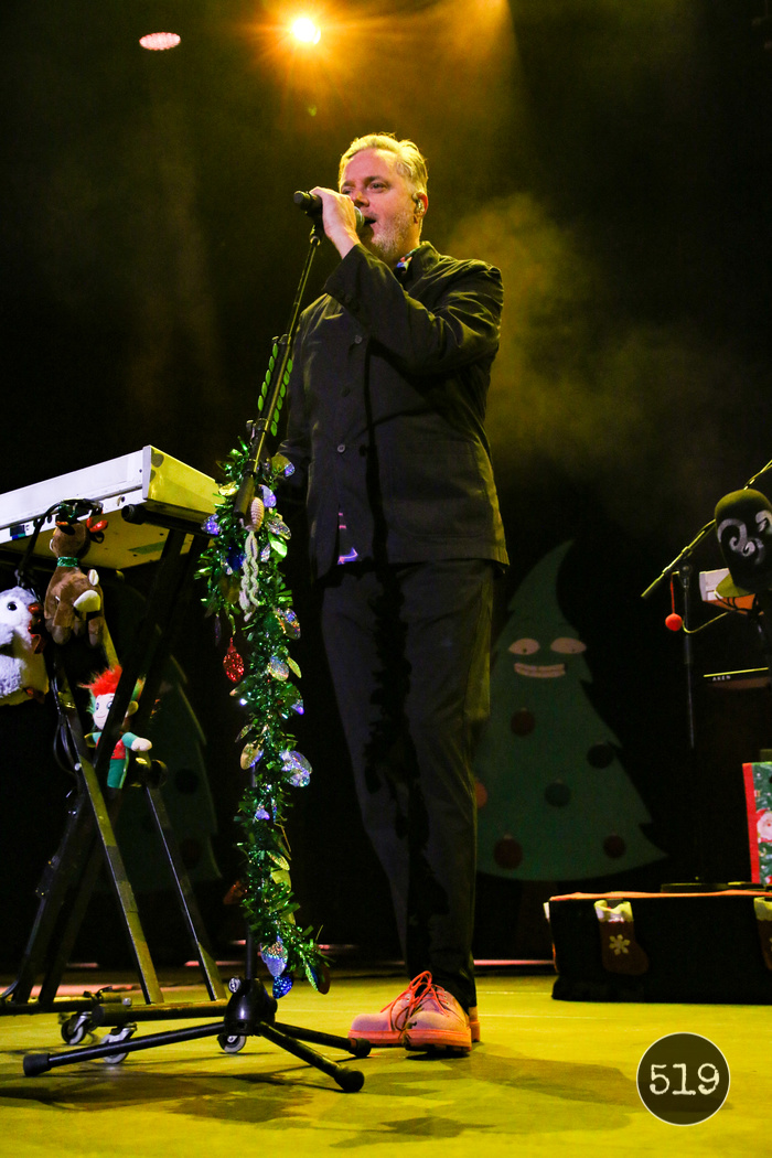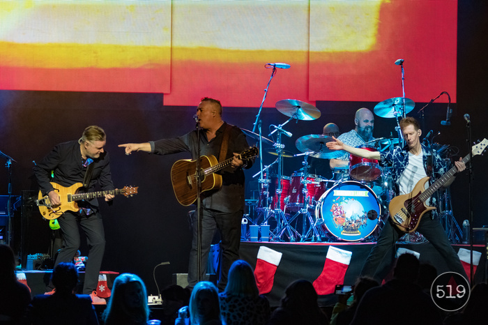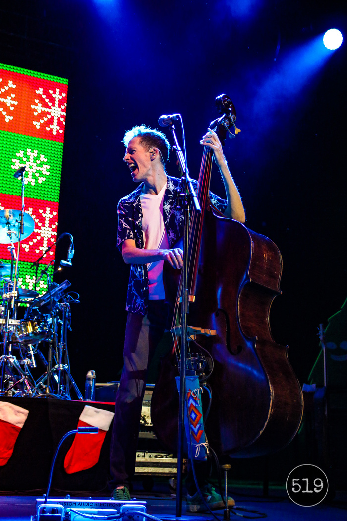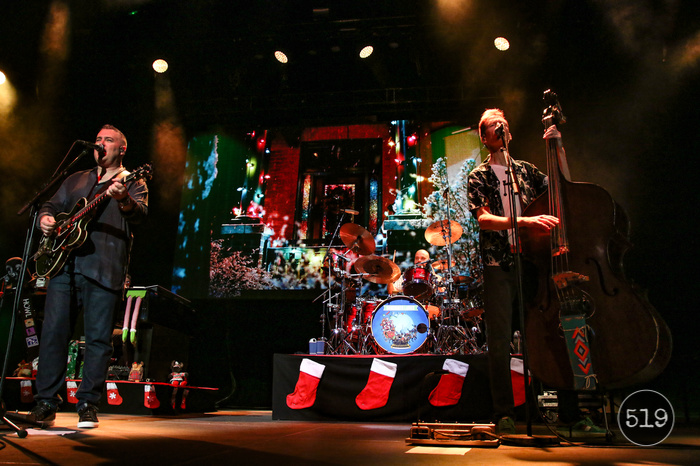 The stage was nicely decorated with some lit-up cartoonish trees, stockings and everything else you’d expect at a Christmas show. The concert oddly began dimly lit as the band performed the Christmas favourite Carol of the Bells, which at one point displayed a video of the band on the big screen that looked much like the famous Queen pose from the Bohemian Rhapsody video with the members (Ed Robertson – vocals, guitar, Jim Creeggan – bass, vocals, Tyler Stewart – drums, percussion, vocals and Kevin Hearn – keyboards, piano, accordion, vocals) posed in a slight diamond shape. After that beautiful intro, it took a few songs for the lights and Ed’s voice to settle in, but then the band looked and sounded like the BNL we all know and love.