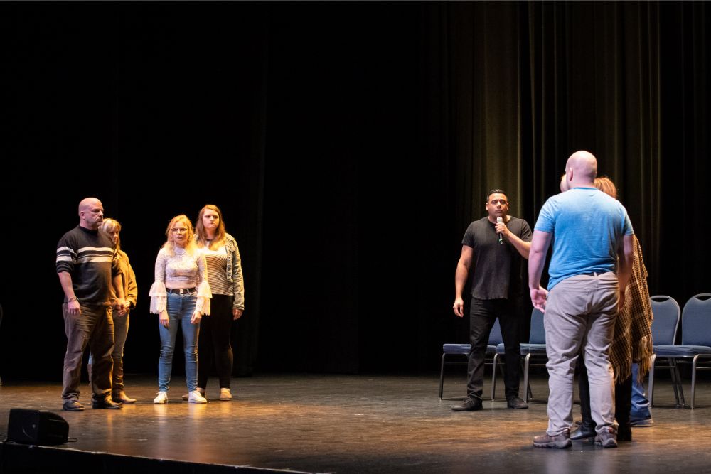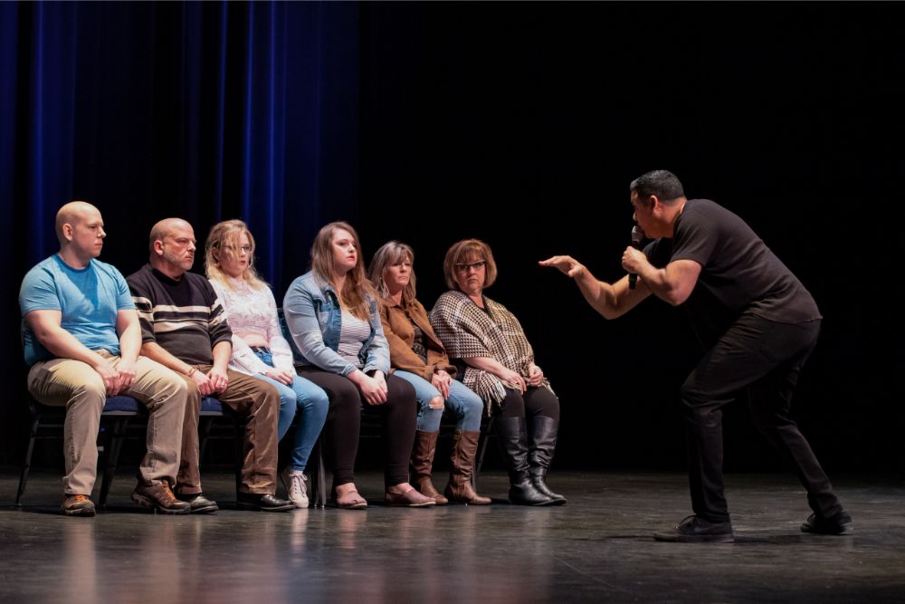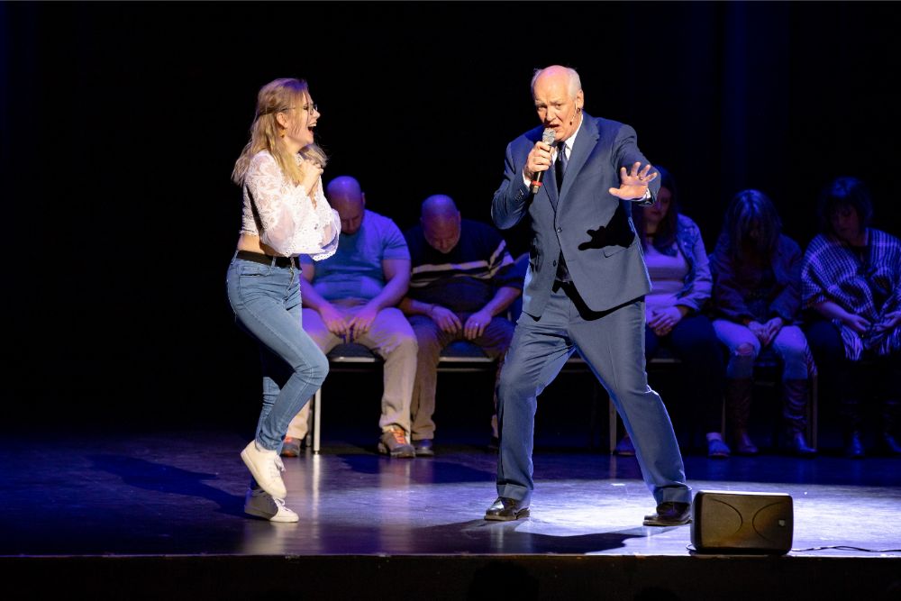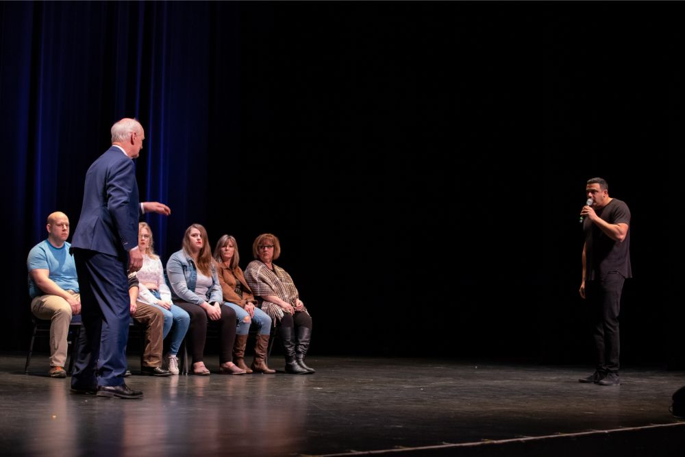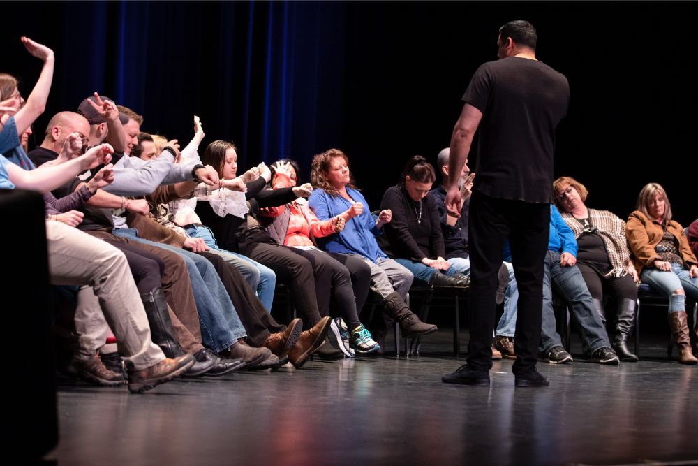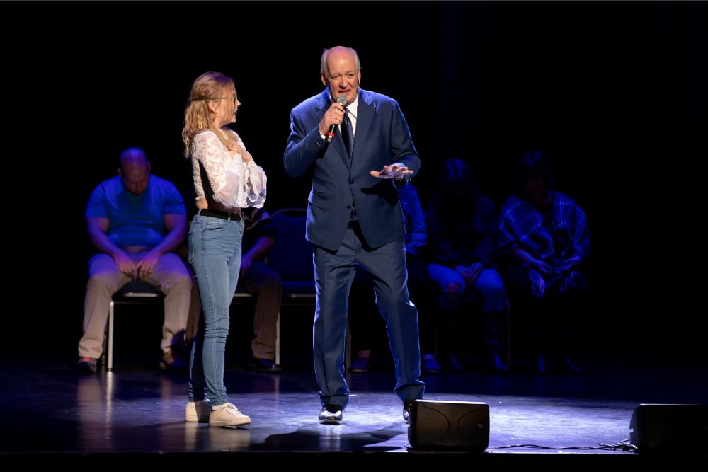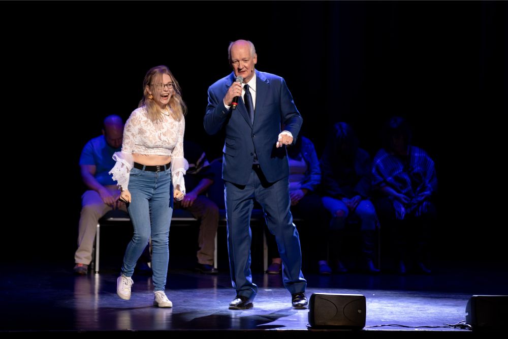 For this one, the show is called Hyprov – a slick merger of hypnotism and improv. To get things going, Mecci gathered 15-20 volunteers from the audience to come on stage and try to fall under the suggestions of hypnotism. The first half of the show takes the audience on a journey to narrow down that crowd to no more than five or six people. From that point, comedy legend Mochrie takes the remaining volunteers (in this case, six of them) and guides them through several improv skits, with content randomly shouted out by the audience before they begin.