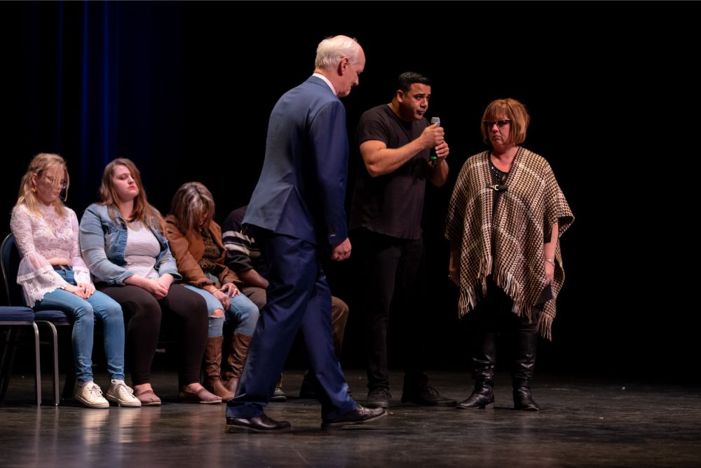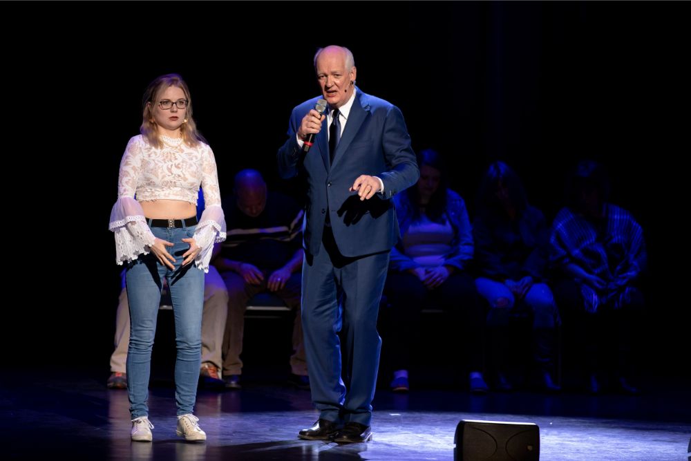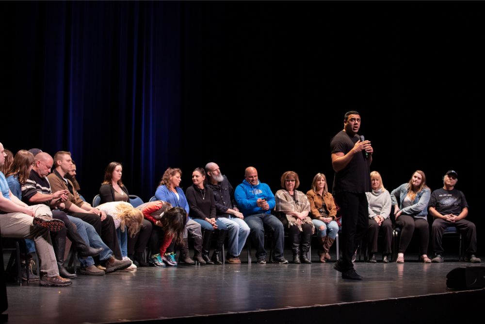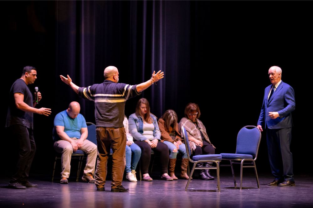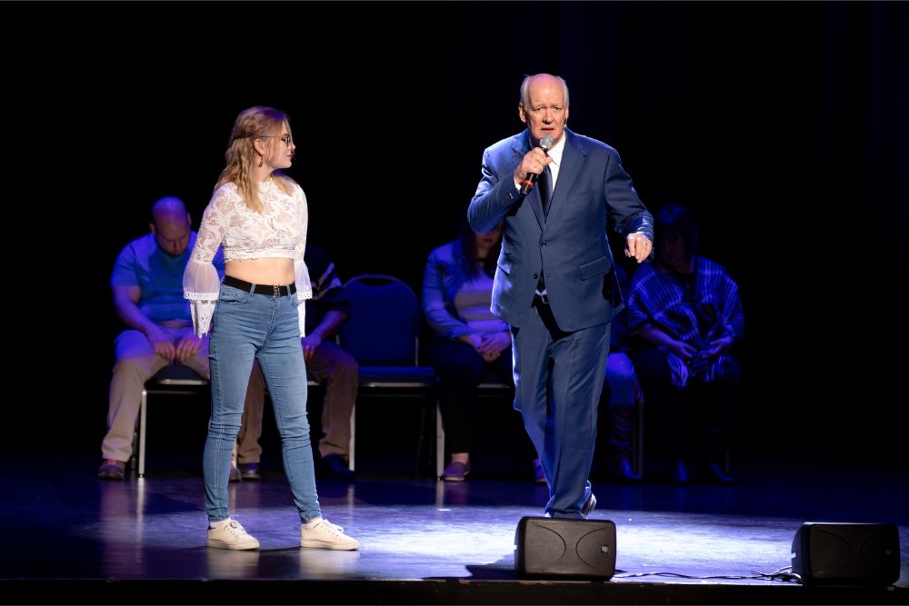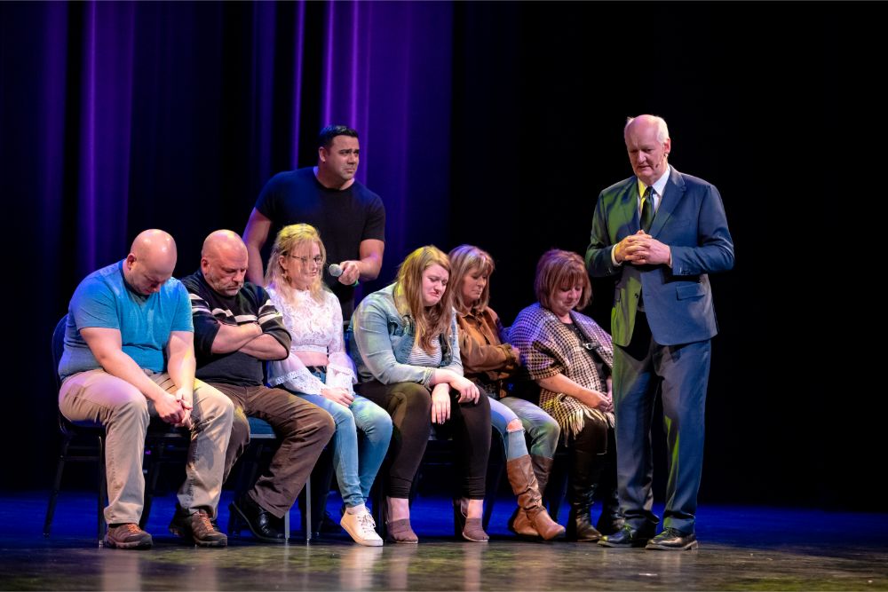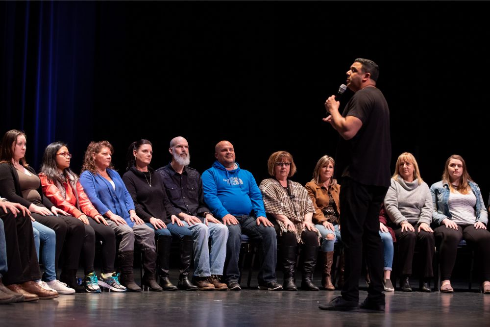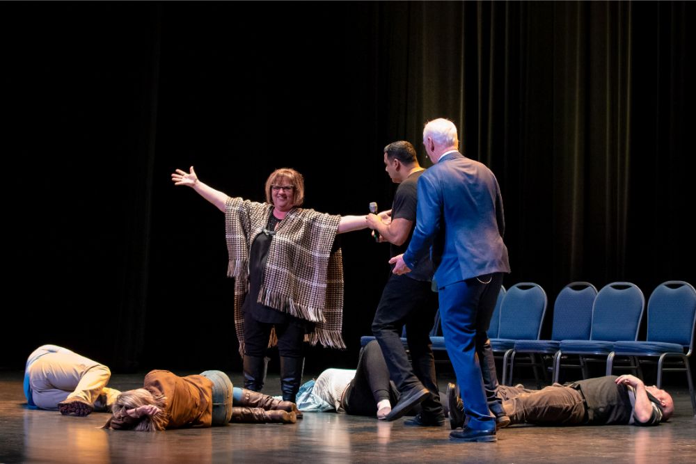 For this one, the show is called Hyprov – a slick merger of hypnotism and improv. To get things going, Mecci gathered 15-20 volunteers from the audience to come on stage and try to fall under the suggestions of hypnotism. The first half of the show takes the audience on a journey to narrow down that crowd to no more than five or six people. From that point, comedy legend Mochrie takes the remaining volunteers (in this case, six of them) and guides them through several improv skits, with content randomly shouted out by the audience before they begin.