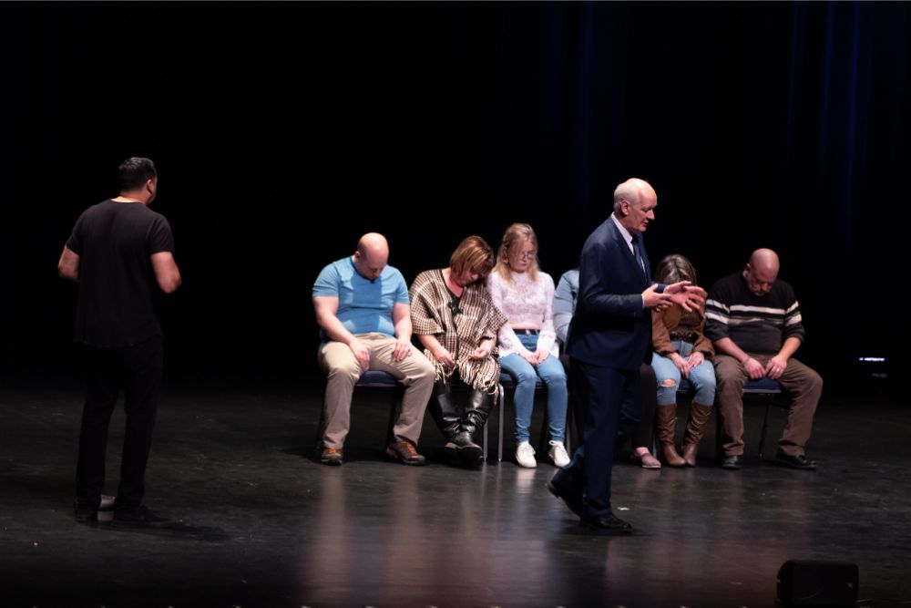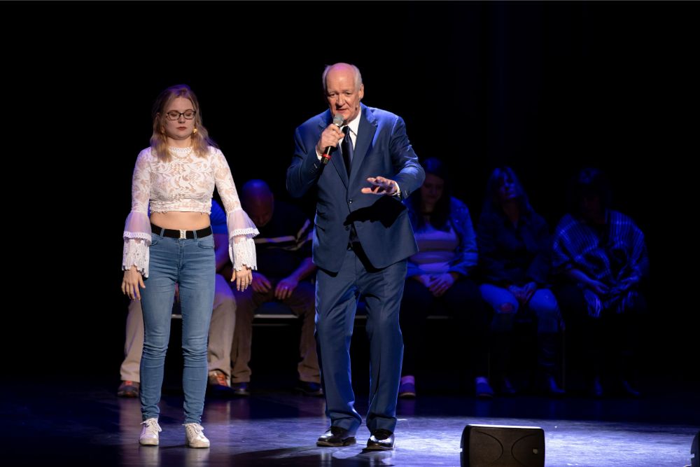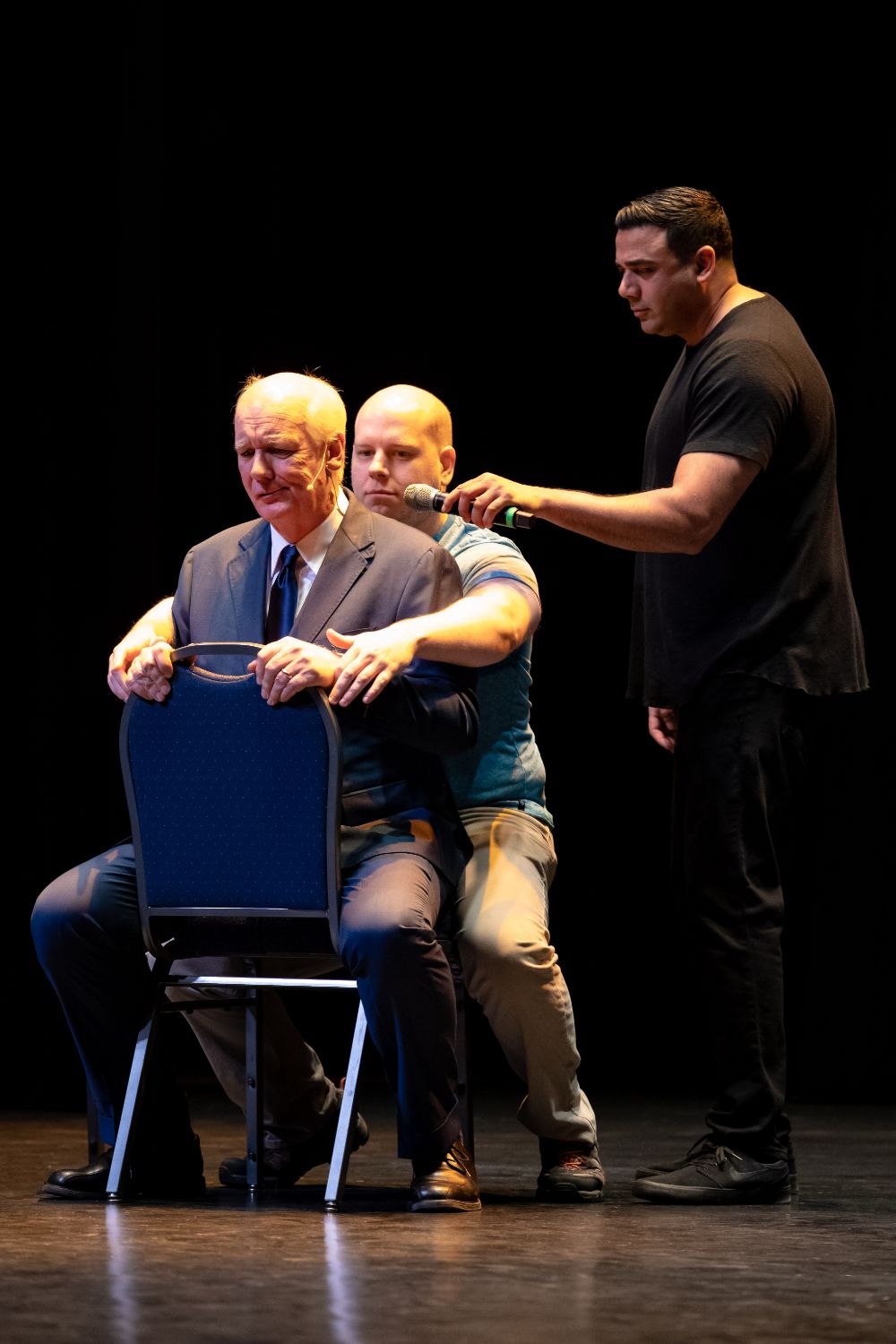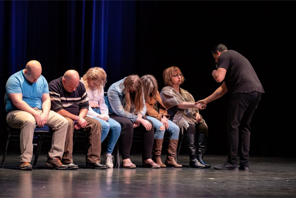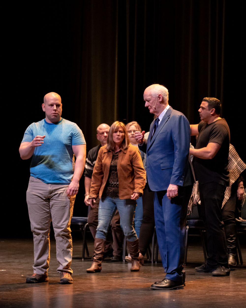 For this one, the show is called Hyprov – a slick merger of hypnotism and improv. To get things going, Mecci gathered 15-20 volunteers from the audience to come on stage and try to fall under the suggestions of hypnotism. The first half of the show takes the audience on a journey to narrow down that crowd to no more than five or six people. From that point, comedy legend Mochrie takes the remaining volunteers (in this case, six of them) and guides them through several improv skits, with content randomly shouted out by the audience before they begin.
