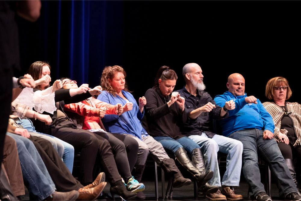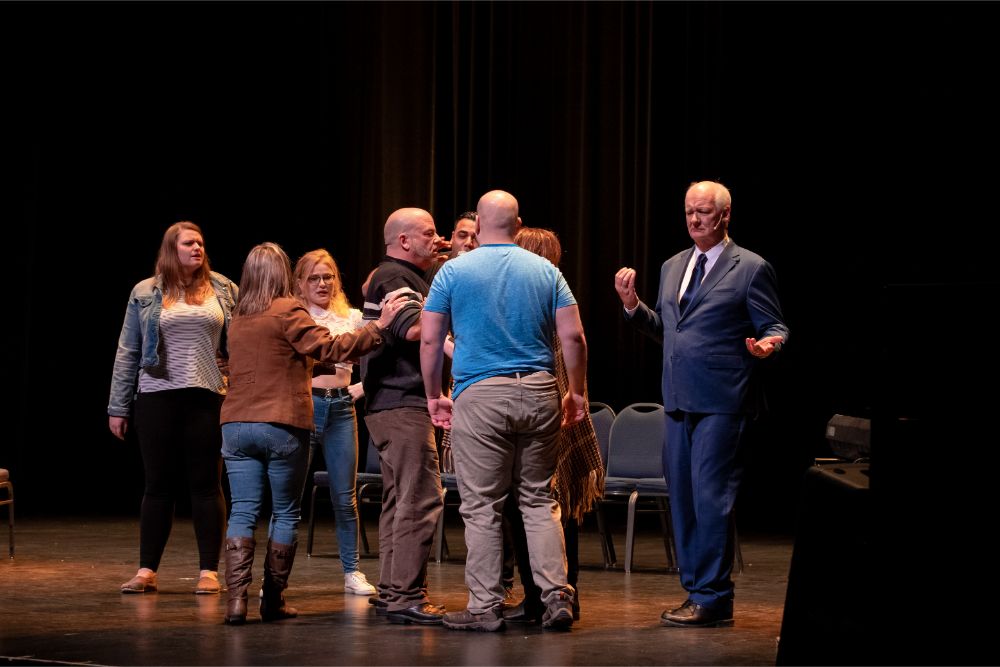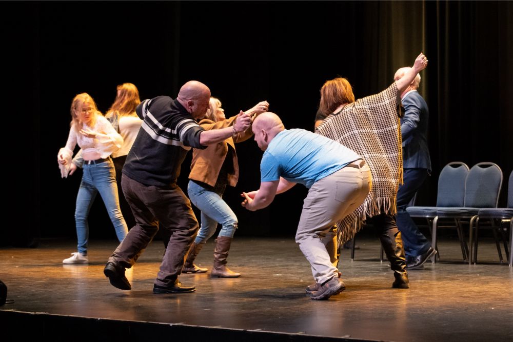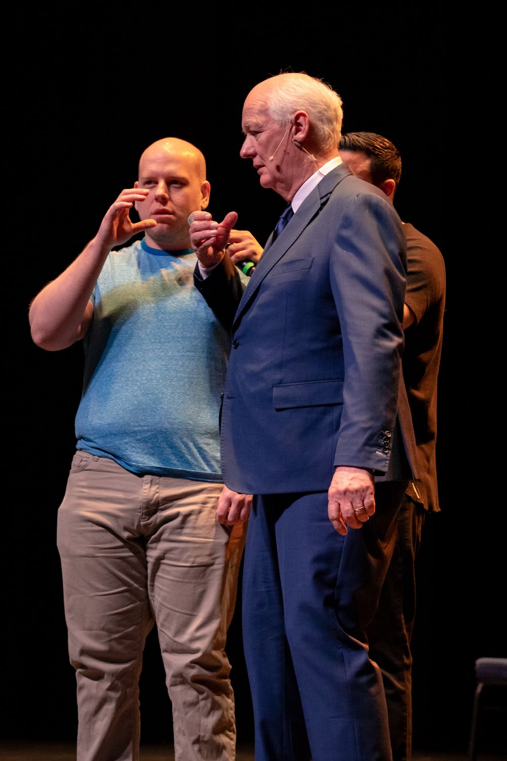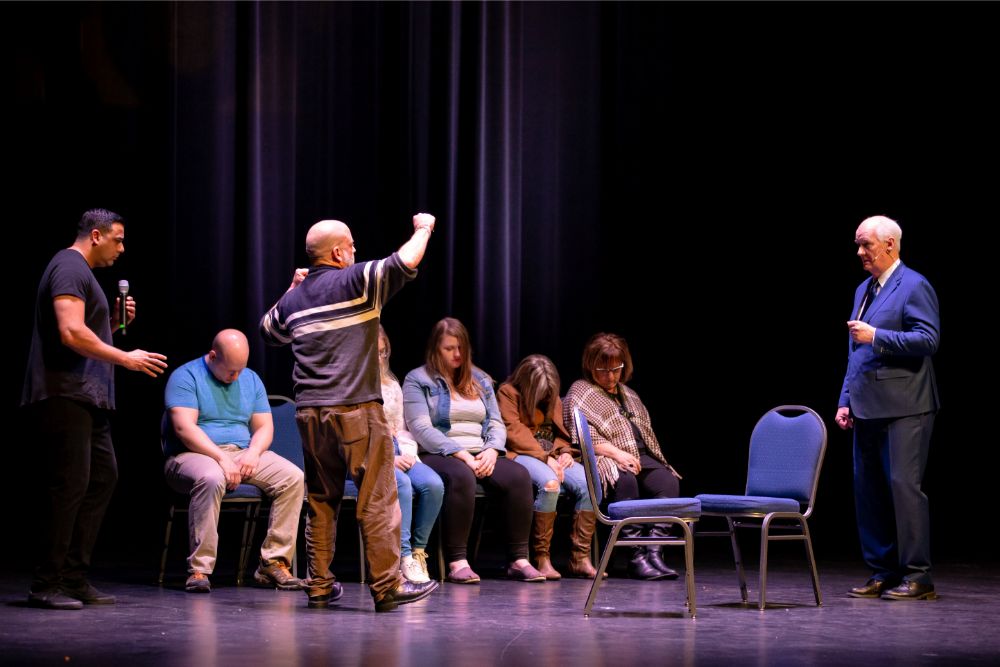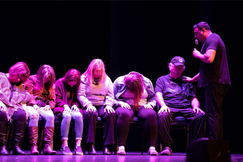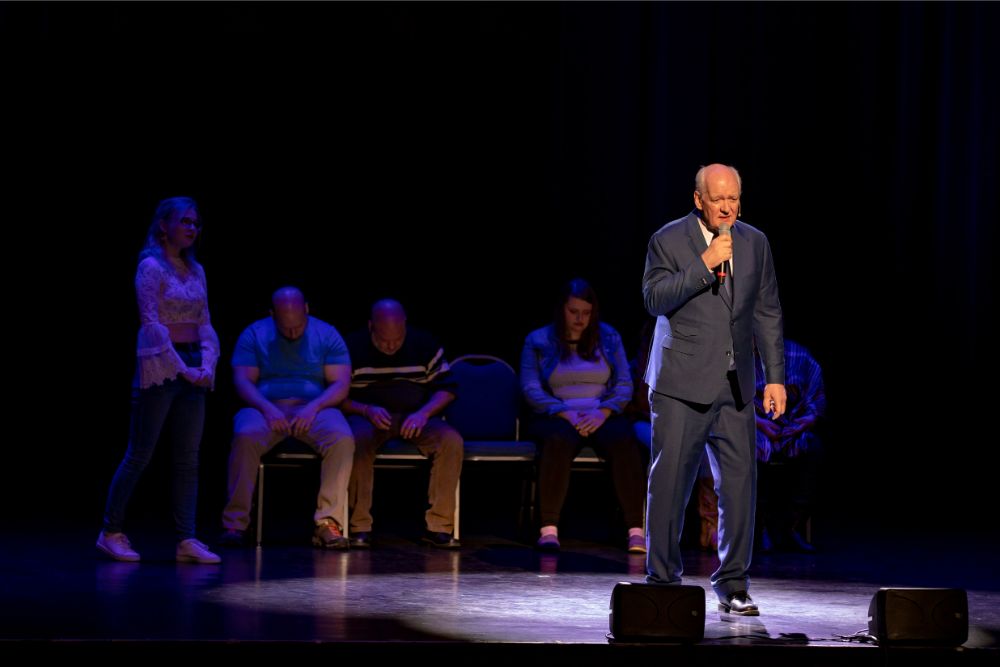 For this one, the show is called Hyprov – a slick merger of hypnotism and improv. To get things going, Mecci gathered 15-20 volunteers from the audience to come on stage and try to fall under the suggestions of hypnotism. The first half of the show takes the audience on a journey to narrow down that crowd to no more than five or six people. From that point, comedy legend Mochrie takes the remaining volunteers (in this case, six of them) and guides them through several improv skits, with content randomly shouted out by the audience before they begin.