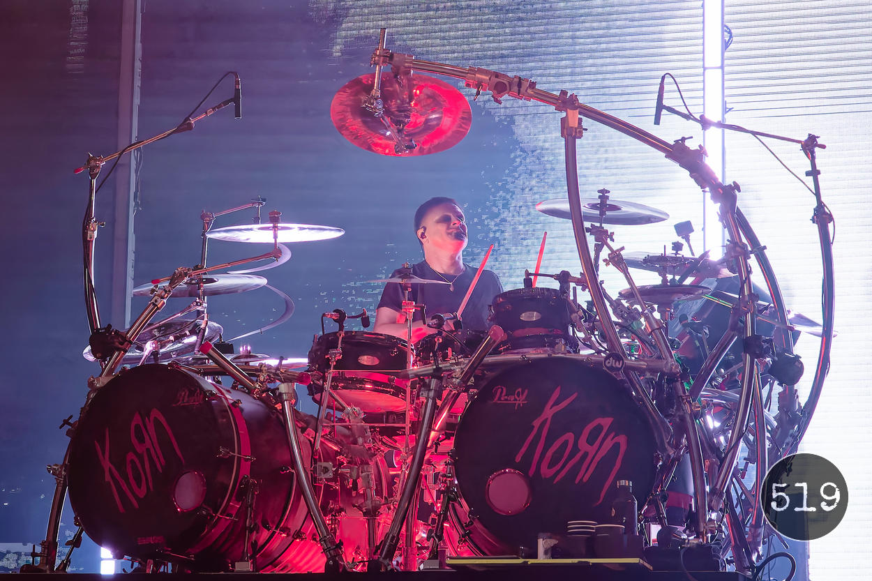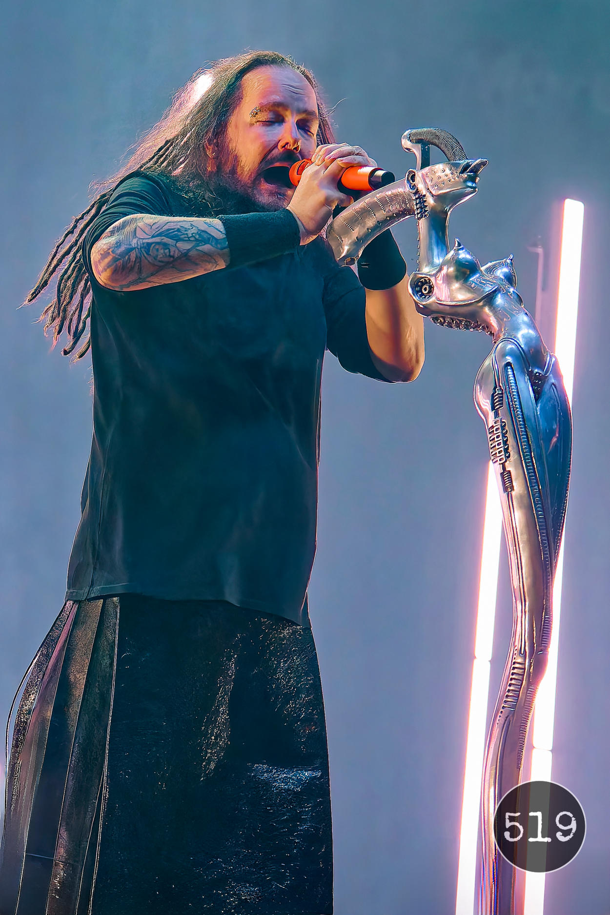 “Twist” and “Here to Stay” maintained the momentum, the latter’s radio-friendly accessibility doing nothing to diminish its live power. When “Got the Life” erupted, the venue transformed into a sea of bodies, the song’s infectious funk-metal swagger proving irresistible. Davis’s bagpipes during “Shoots and Ladders” provided a surreal interlude, the juxtaposition of nursery rhymes and metal remaining as unsettling as intended.