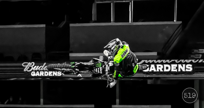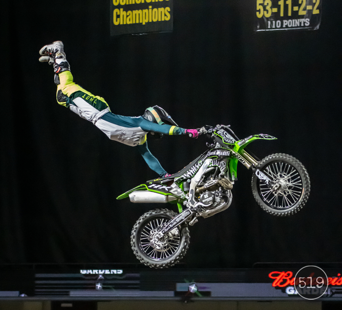 As the show started, each rider was given 90 seconds to showcase the best of the best tricks from their arsenal. They were launched 50 feet into the air off a metal ramp and worked their magic as they flew 75 feet across the arena floor onto the landing ramp. Unfortunately, Curtis “dirtkurt” Williams lost control of his bike during his run and had to retire with an arm injury; thus, showing the actual danger involved in these motorcycle aerobatics.