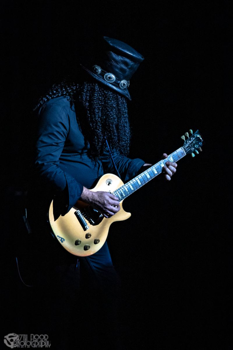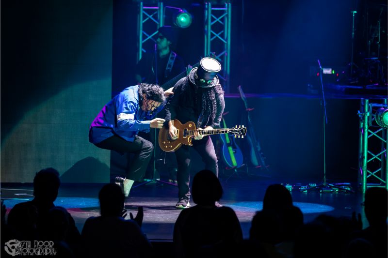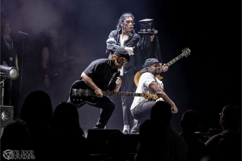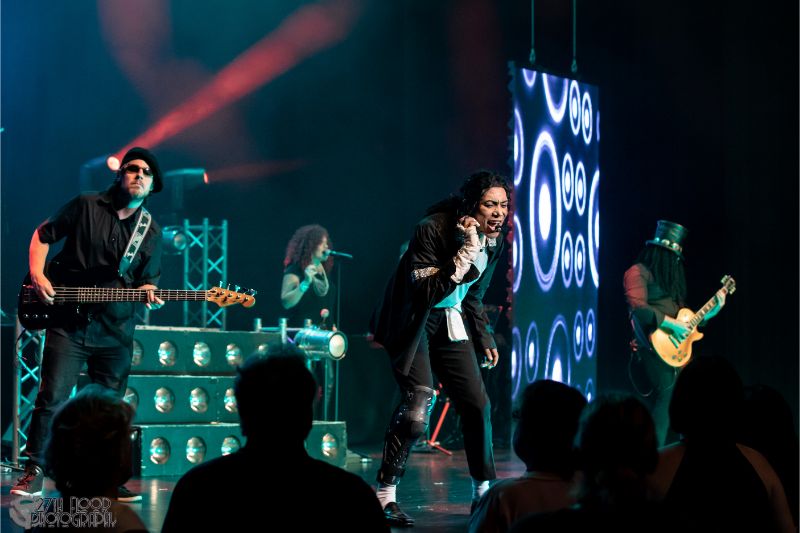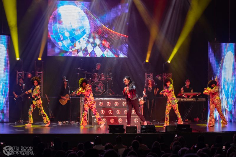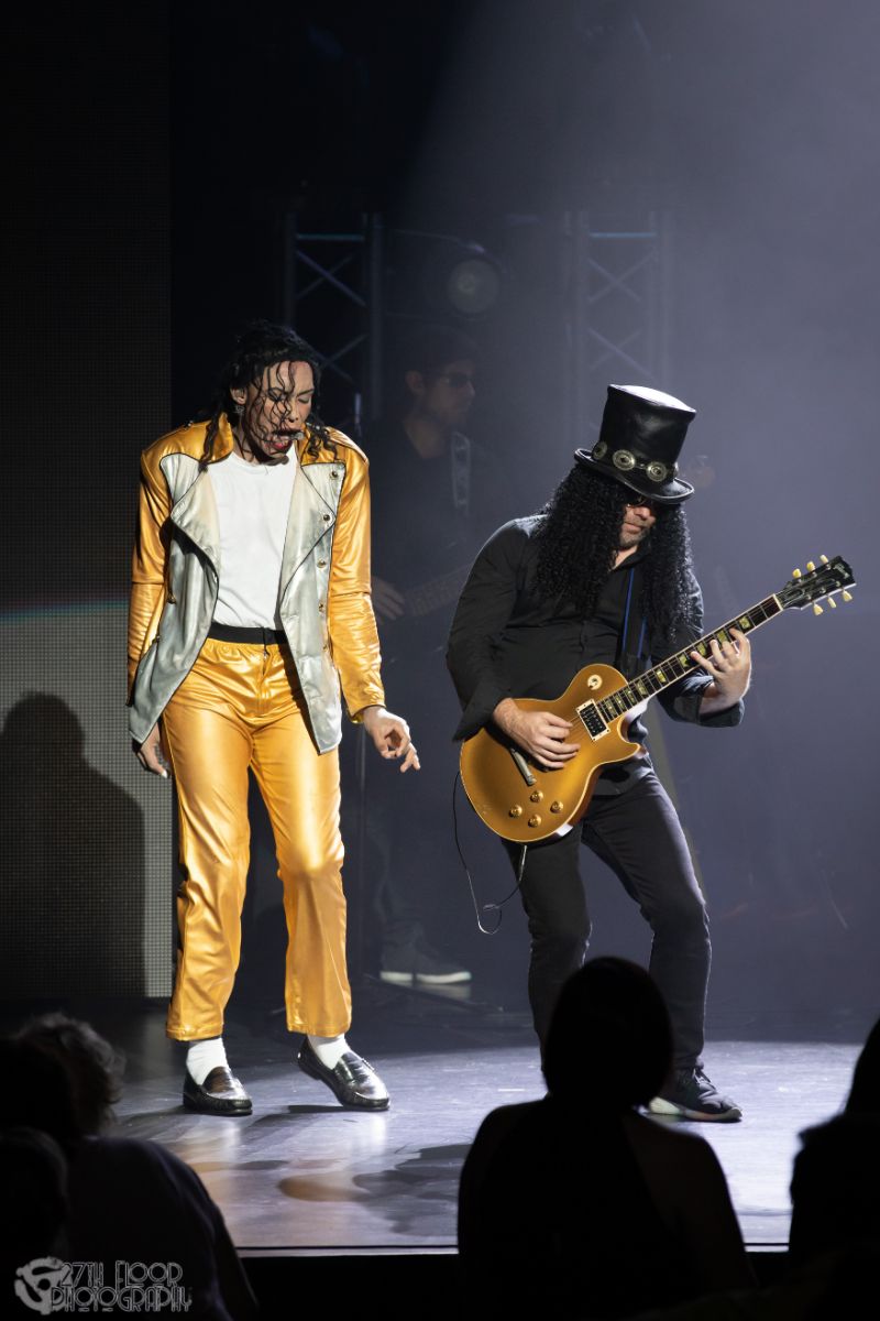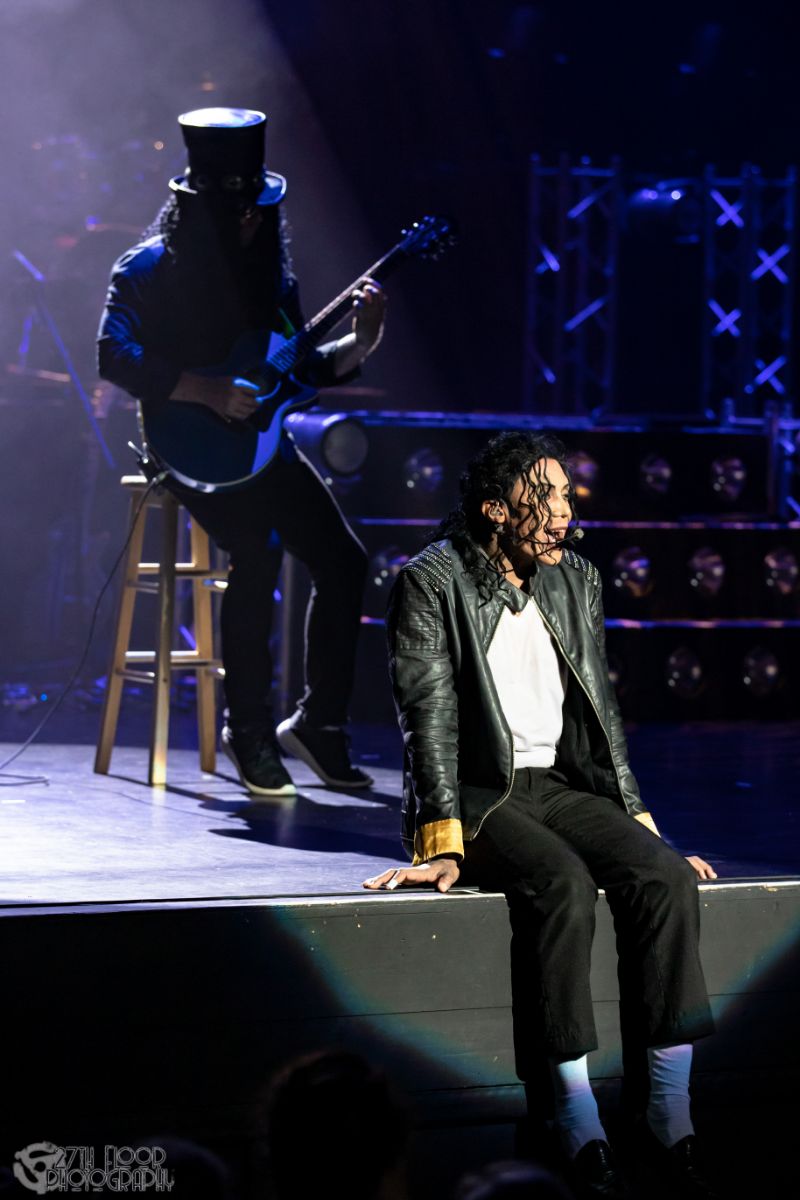The show covers Jackson’s entire career and all the popular hits you would expect to hear performed including some Jackson Five numbers. The production featured a four piece band, four dancers and a backup singer. The costume changes were many, I lost count during the show, and the production itself was top notch. During the Jackson Five songs, the four dancers wore afro wigs and colourful bell bottomed suits to bring the audience back to the early 70’s. Other choreographed numbers featured gangster suits, military uniforms with helmets, street gang styled outfits and many others. The show’s guitarist and musical director wore a Slash outfit during the entire show. Slash performed many times with Jackson on recordings, in videos and live performances. Besides the multiple costume changes and tightly choreographed numbers, the stage featured three large LED screens showing various photos and videos of the real Jackson plus various themed images to go with each song.